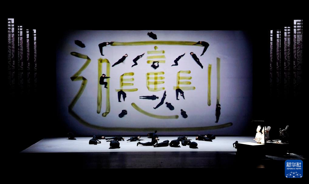 西安大唐芙蓉园内上演的舞台剧《鼓》(2024年1月24日摄)。