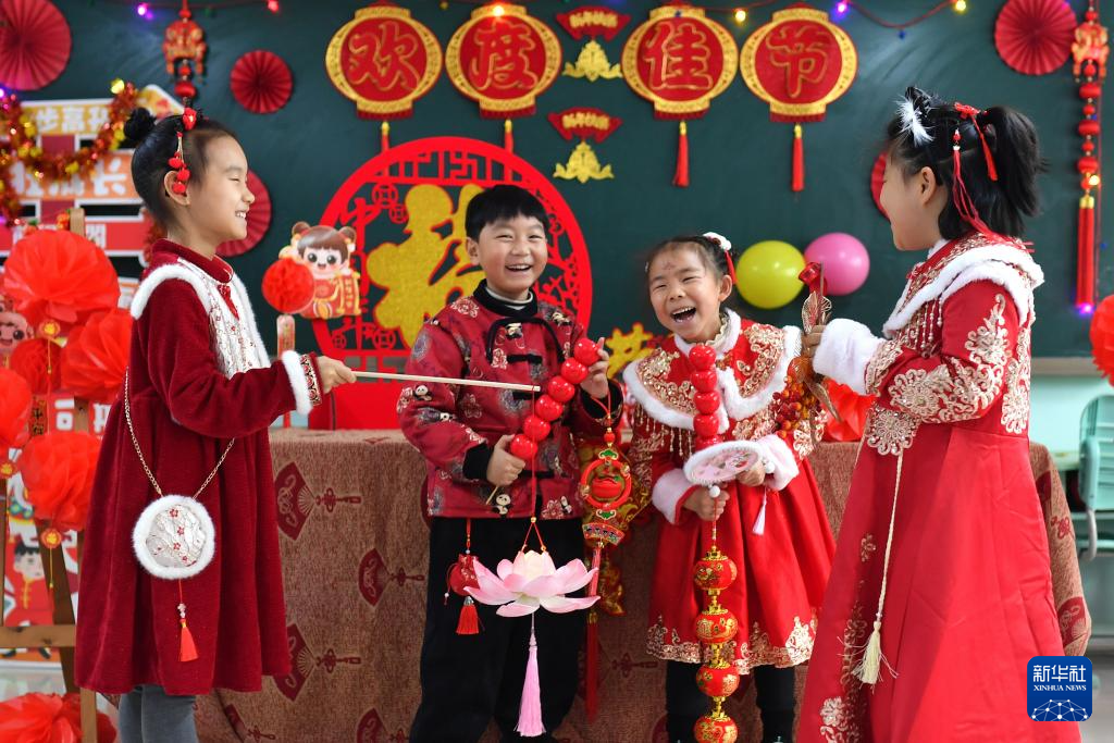 1月14日,在山东青岛北仲路第二小学开展的“国风古韵”迎新春主题活动上,学生们登台表演过年习俗。