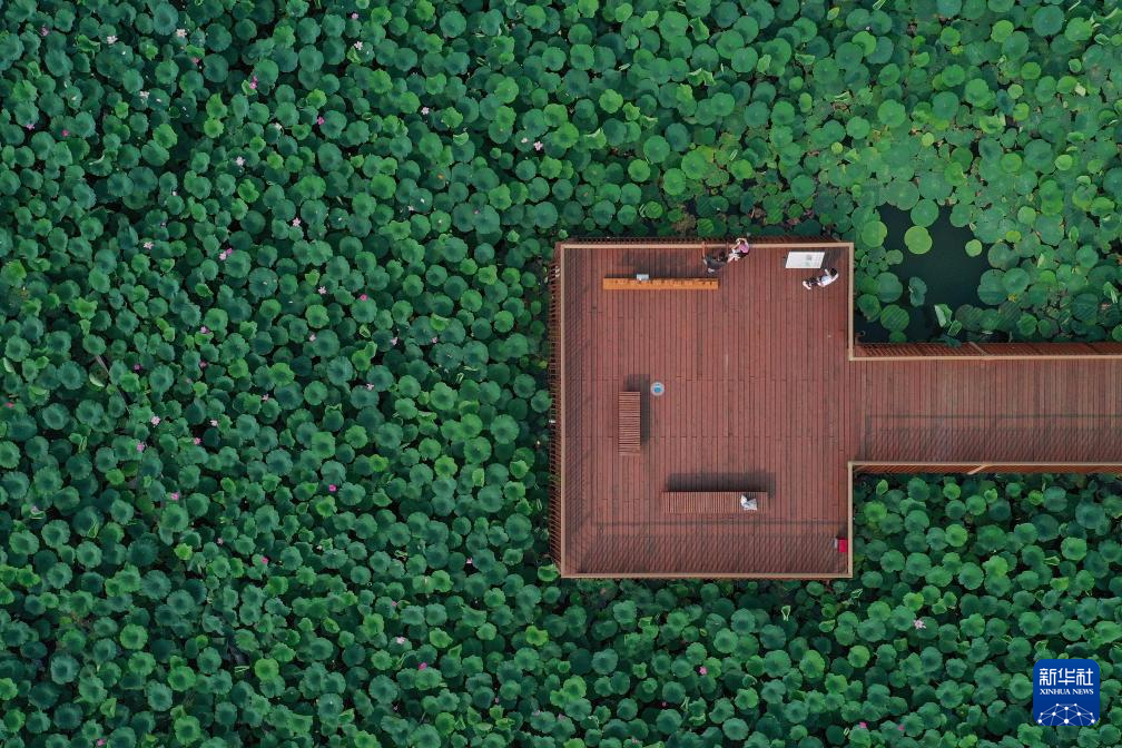 7月10日,游人在江苏南京玄武湖公园赏荷(无人机照片)。