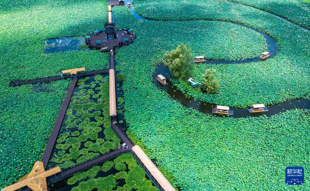 7月21日,游客在江苏省兴化市万亩荷塘景区赏荷游玩(无人机照片)。