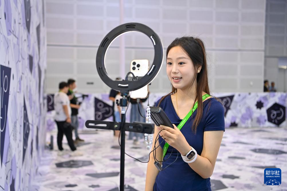 8月21日,工作人员在第七届山西文化产业博览交易会上直播。