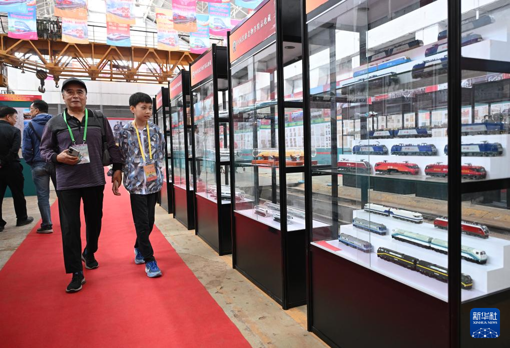 9月27日,观众在第三届中国铁路文化收藏博览会上参观不同型号的铁路机车模型。