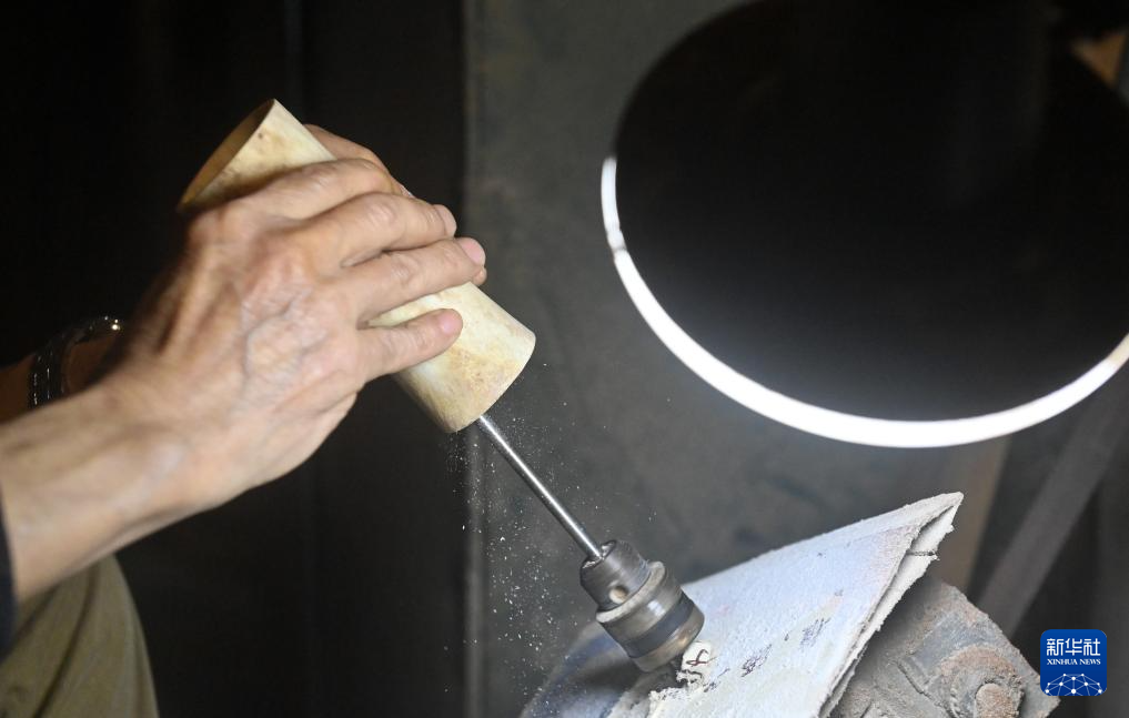 10月10日,黄一格在家中雕刻一把马骨胡的琴头。