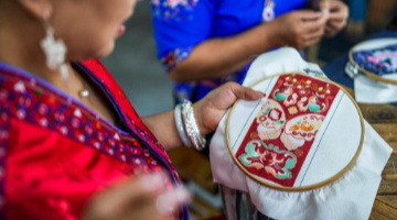 龙禄颖(中)在位于贵州省施秉县的舞水云台非遗工坊进行刺绣创作(10月10日摄)。