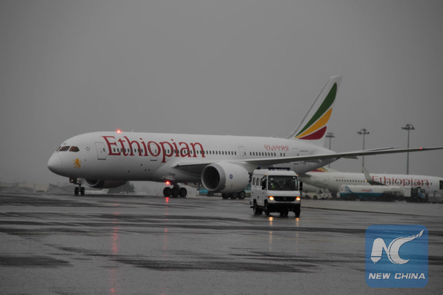 Photo taken on Oct. 12, 2017 shows an Ethiopian Airlines plane at the Bole International Airport in Addis Ababa, capital of Ethiopia. Ethiopian Airlines Group which is the largest airline group in Africa has been voted as the 2017 Middle East and Africa Airline of the Year by Airline Economics Magazine. (Xinhua/Michael Tewelde)