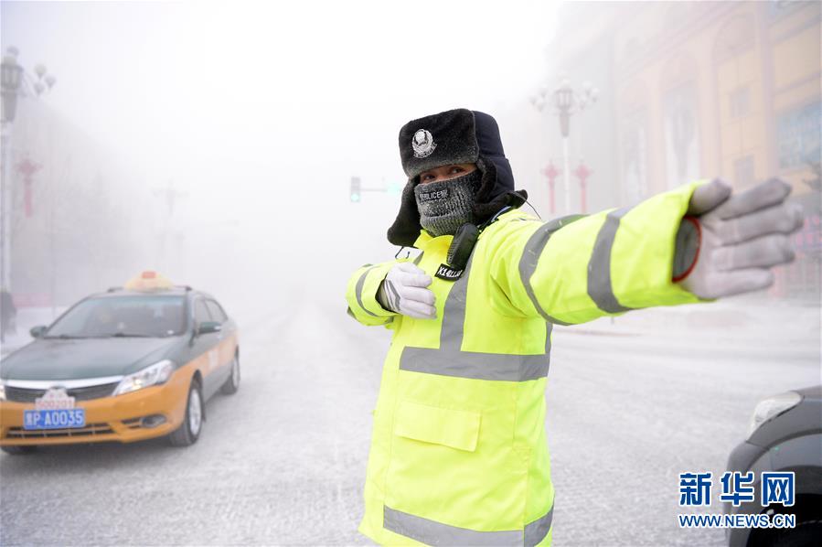 A policeman directs traffic on a main road in Mohe County, northeast China’s Heilongjiang Province, Jan. 24, 2018. Mohe County recorded minus 40 degrees Celsius on Jan. 24, 2018. (Xinhua/Wang Kai)