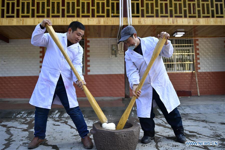 Cooks make Ciba, or glutinous rice cakes, to greet the upcoming Spring Festival in Banchang Village of Xuan'en County, Enshi Tujia and Miao Autonomous Prefecture, central China's Hubei Province, Jan. 11, 2018. The handmade Ciba, usually decorated with patterns, is the traditional food for people of Tujia and other ethnic minorities on the Spring Festival, which falls on Feb. 16 this year. (Xinhua/Song Wen)