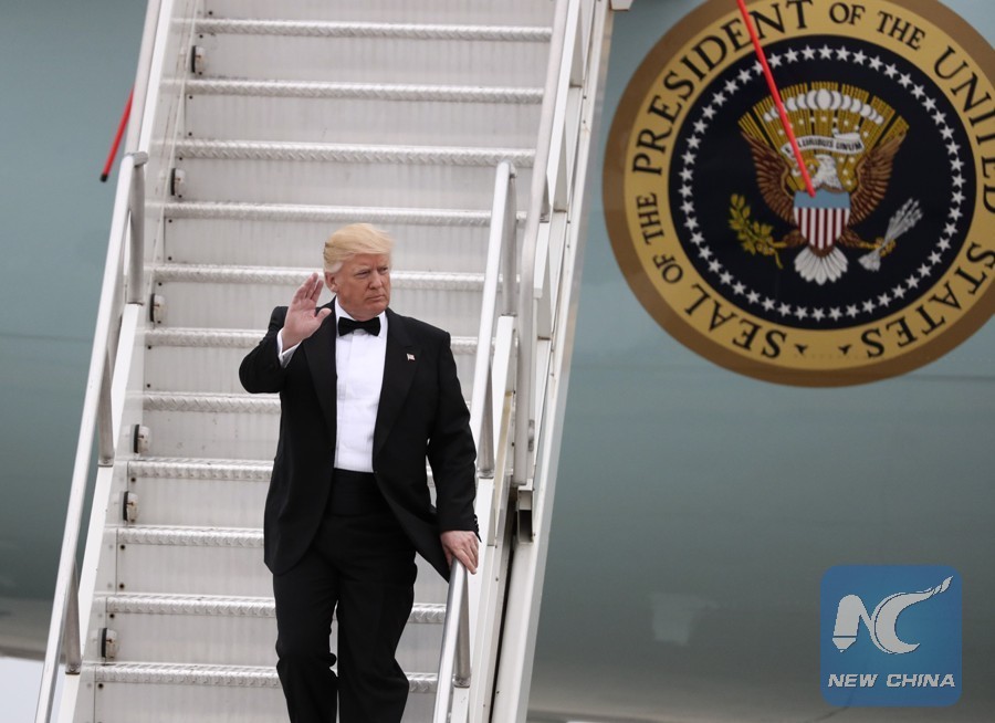 U.S. President Donald Trump walks down the stairs from the Air Force One at John F. Kennedy International Airport in New York, the United States, May 4, 2017. (Xinhua/Wang Ying)