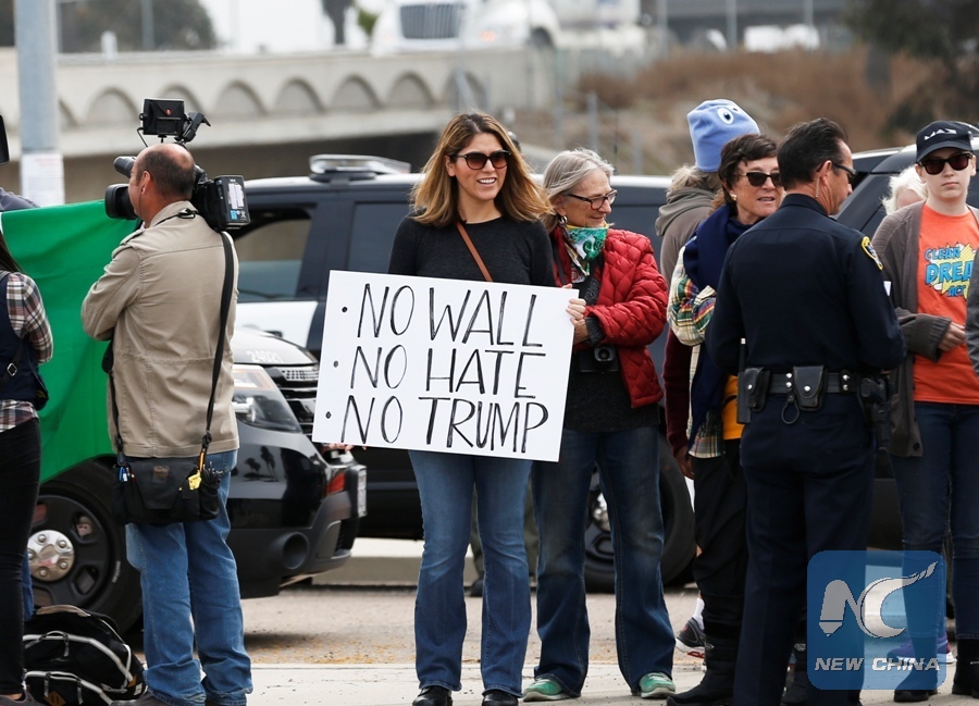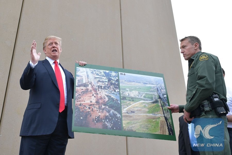 SAN DIEGO, the United States, March 13 (Xinhua) -- U.S. President Donald Trump on Tuesday inspected prototypes for his long-promised wall along the border with Mexico in a tour that drew both supporters and protesters.