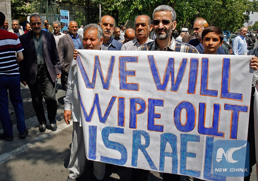Iranians hold a banner with an anti-Israel message in Tehran on May 18, 2018, as they take part in a demonstration after weekly Friday prayers. (AFP PHOTO)