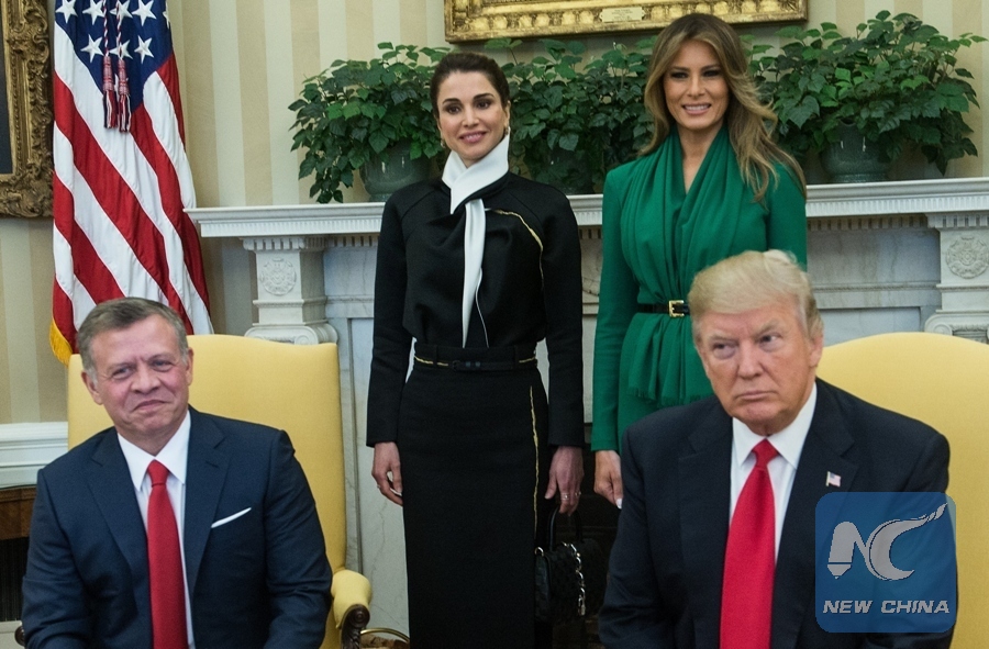 File Photo: U.S. President Donald Trump (R) meets with King Abdullah II of Jordan in the Oval Office at the White House as First Lady Melania Trump and Queen Rania look on in Washington, D.C., on April 5, 2017. (Xinhua/AFP)