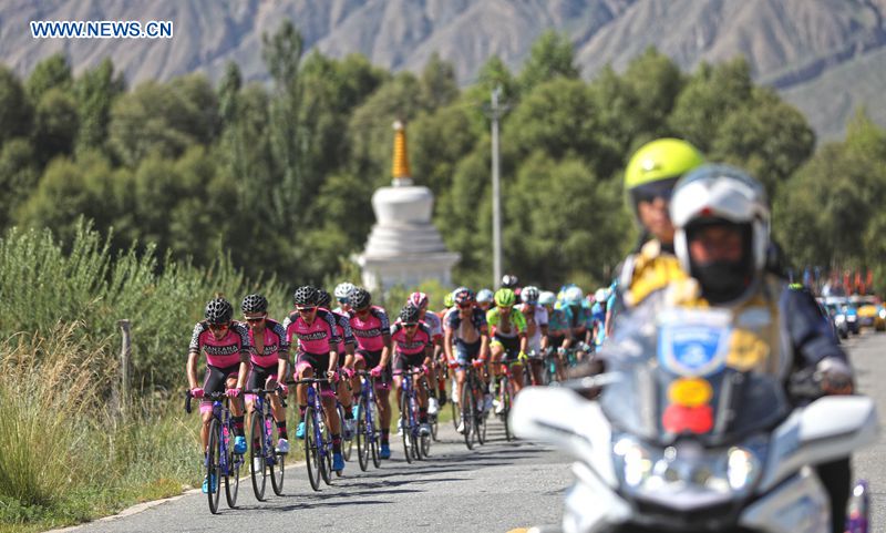 Cyclists compete in the fourth stage of the Tour of Qinghai Lake in northwest China's Qinghai Province, on July 25, 2018. (Xinhuanet Photo by Jia Haiyuan)