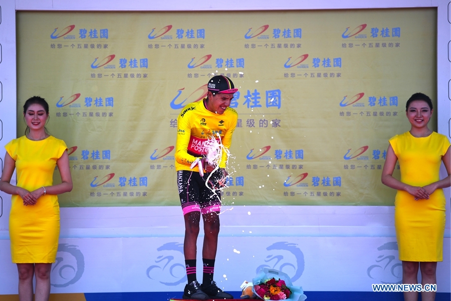 Hernan Aguirre from Manzana Postobon celebrates with yellow jersey at the award ceremony of the tenth stage of the Tour of Qinghai Lake in northwest China's Gansu Province, on August 1, 2018.(Xinhuanet Photo by Yang Shoude)