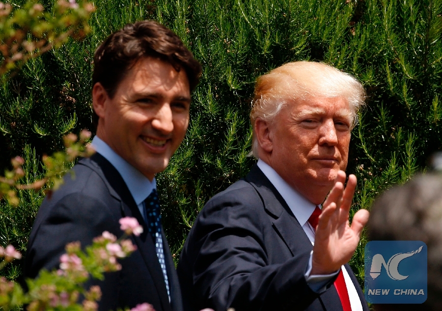 File Photo: U.S. President Donald Trump (R) waves next to Canadian Prime Minister Justin Trudeau following a family photo with participants of the G7 summit during the Summit of the Heads of State and of Government of the G7, plus the European Union, on May 27, 2017 in Taormina, Sicily. (Xinhua/AFP)