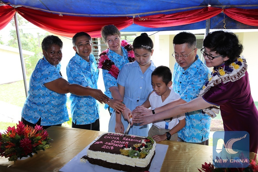 Chinese Ambassador to Fiji Qian Bo (2nd R), Allision Burchell (3rd L), permanent secretary for Fiji's Ministry of Education, Heritage and Arts, and Kong Hongmei (1st R), chief of the cultural delegation from Zhengzhou of central China's Henan Province, and Deng Xianfu (2nd L), director of China Cultural Center in Fiji, cut the cake marking the opening of China Reading Corner in Suva, Fiji, on Sept. 28, 2018. (Xinhua/Zhang Yongxing)