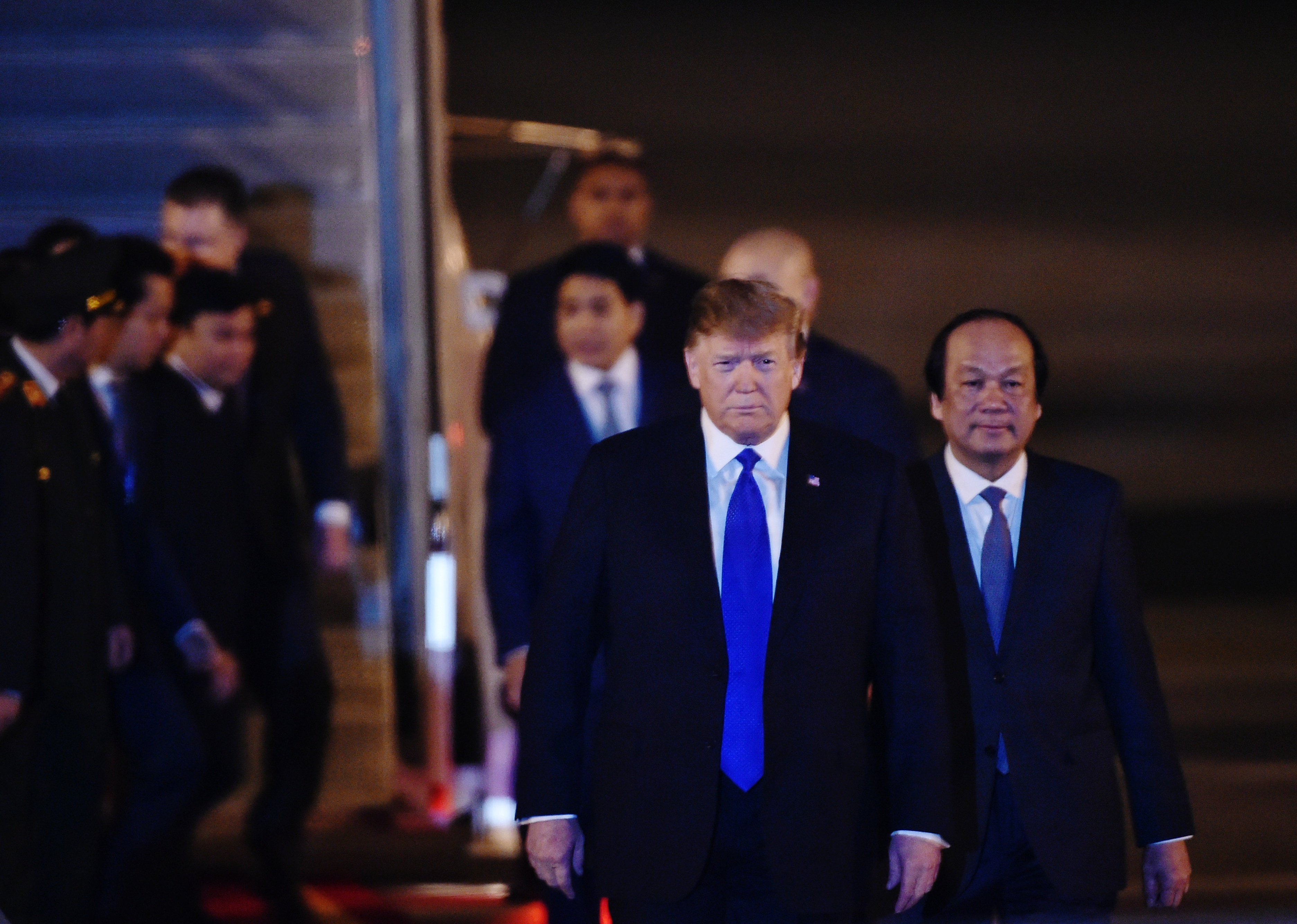 U.S. President Donald Trump (front) arrives at an airport in Hanoi, Vietnam, Feb. 26, 2019. Trump will meet with Kim Jong Un, top leader of the Democratic People's Republic of Korea. (Xinhua/Wang Shen)