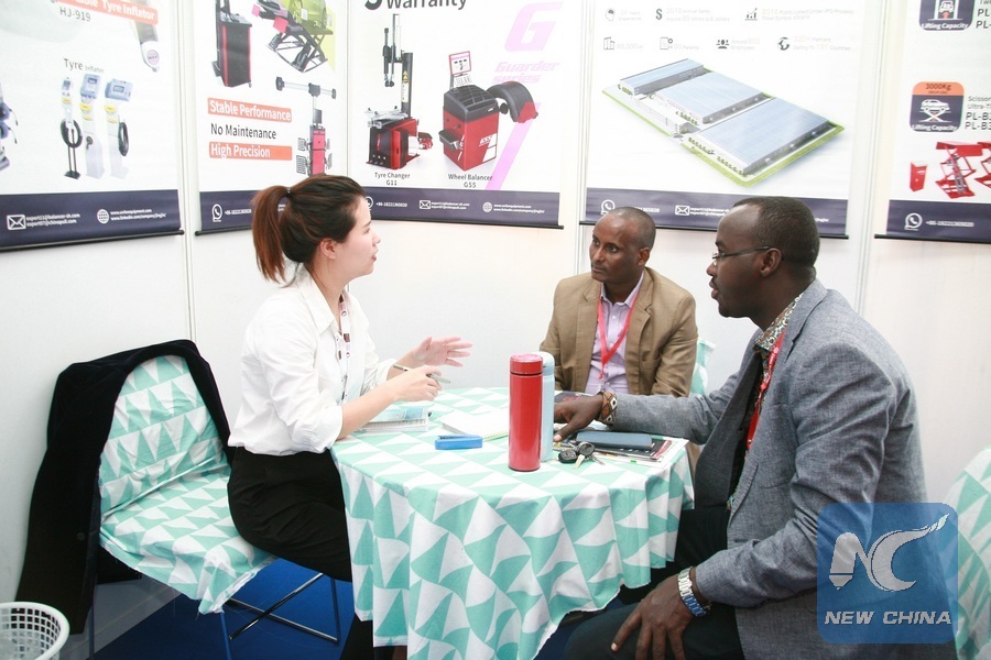 A trader (L) converses with customers during the 5th Edition of China Trade Week at Kenyatta International Convention Center (KICC) in Nairobi, capital of Kenya, June 7, 2019. China Trade week is a series of successful Business-to-Business (B2B) and Business-to-Government (B2G) trade platforms across the Middle East and Africa covering multiple industries including building and construction materials, lighting, furniture and interior, technology, agriculture, textiles and auto parts. (Xinhua/Charles Onyango)
