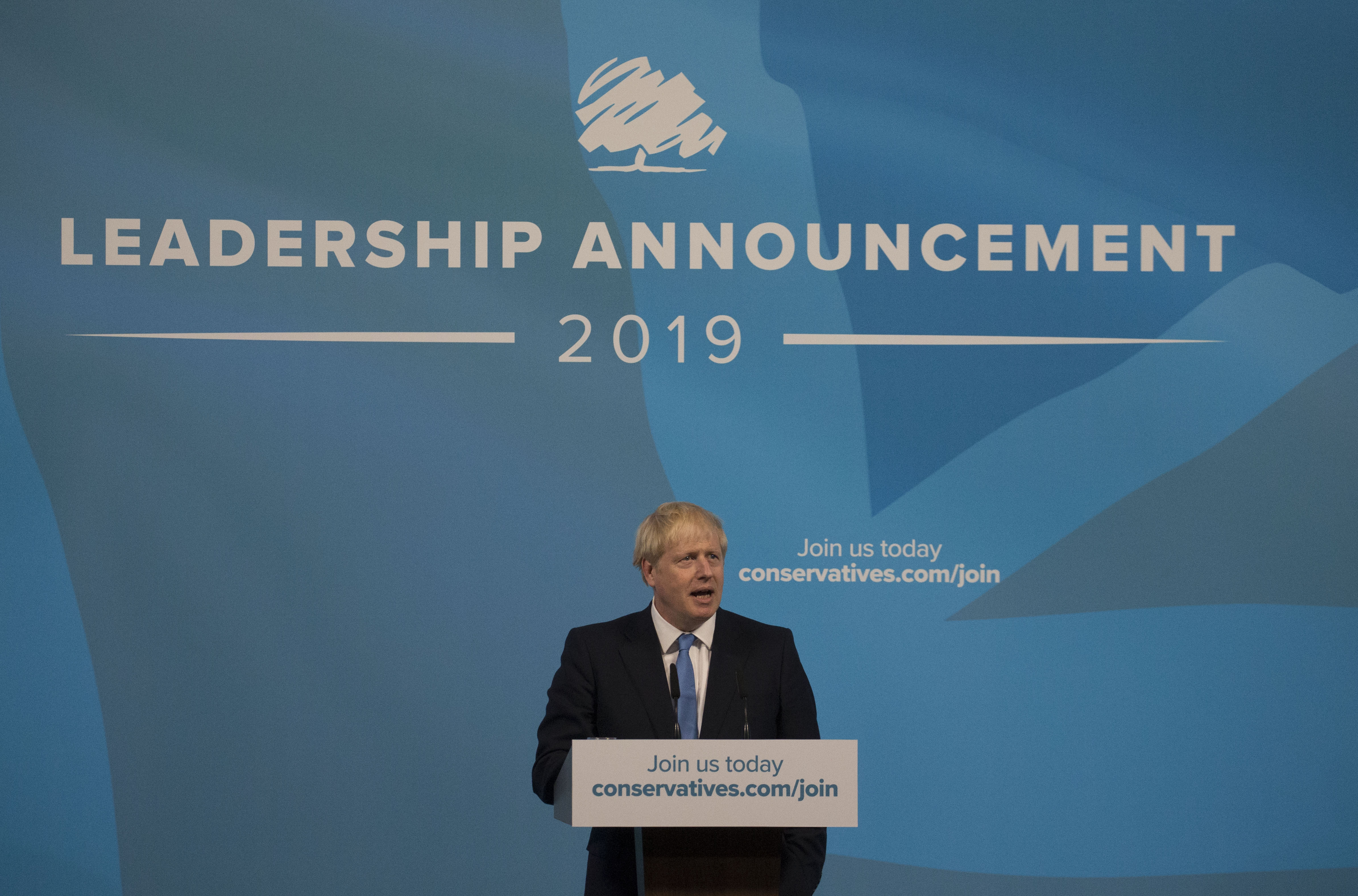 Newly elected Conservative party leader Boris Johnson poses outside the Conservative Leadership Headquarters in London, Britain, on July 23, 2019. (Photo by Alberto Pezzali/Xinhua)