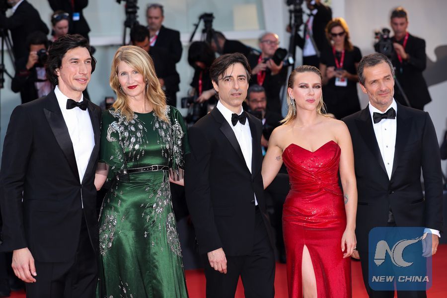 Director Noah Baumbach (C) and other cast members pose on the red carpet for the premiere of the film "Marriage Story" during the 76th Venice International Film Festival in Venice, Italy, Aug. 29, 2019. (Xinhua/Zhang Cheng)