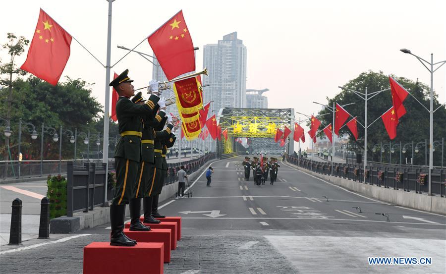 Photo taken on Oct. 1, 2019 shows the morning scenery on the Haizhu Bridge in Guangzhou, capital of south China's Guangdong Province. Celebrations for the 70th anniversary of the founding of the People's Republic of China (PRC) will be held Tuesday in central Beijing. (Xinhua/Lu Hanxin)
