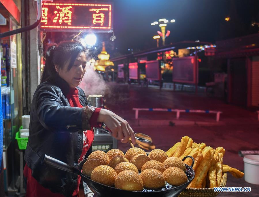 A woman makes breakfast at a shop in a street in Lhasa, capital of southwest China's Tibet Autonomous Region, Oct. 1, 2019. Celebrations for the 70th anniversary of the founding of the People's Republic of China (PRC) will be held Tuesday in central Beijing. (Xinhua/Jigme Dorje)