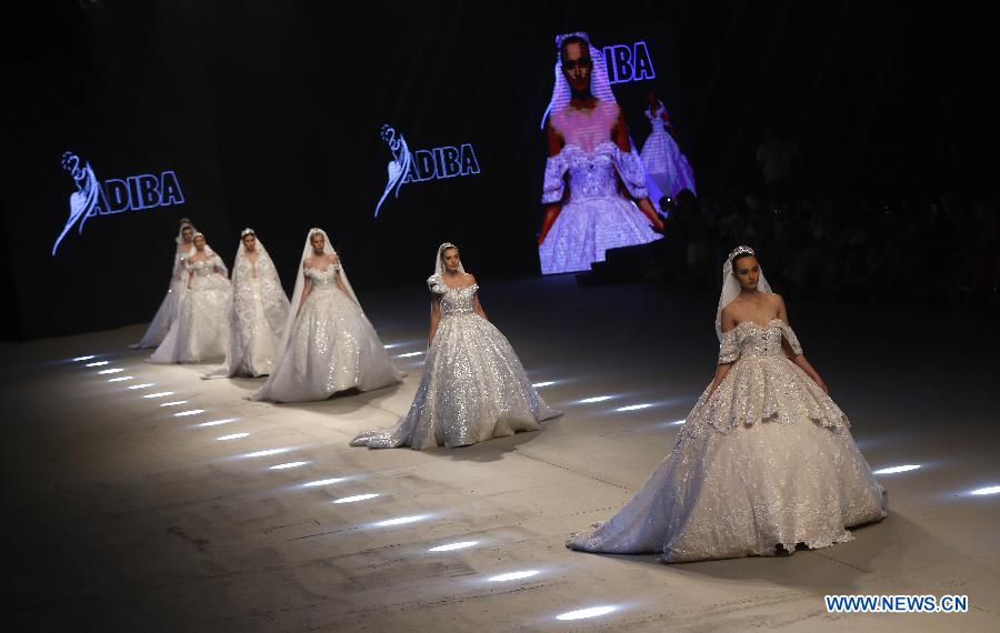 Models present creations by Kuwaiti designer Adiba Al Mahboub during the "Designers & Brands" fashion show in Beirut, Lebanon, on Oct. 8, 2019. (Photo by Bilal Jawich/Xinhua)