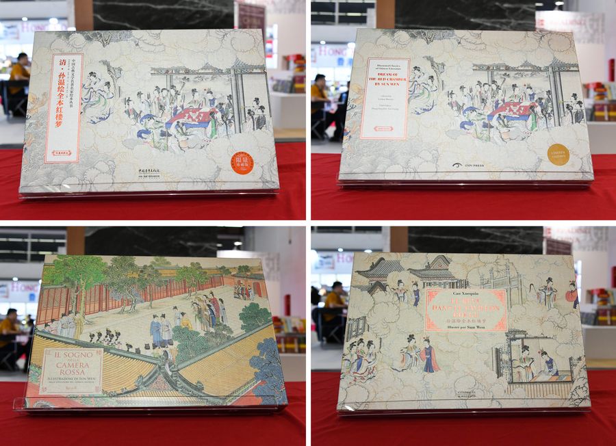 Limited editions in Chinese, English, French and Italian (clockwise) of "Illustrated Classics of Chinese Literature: Dream of the Red Chamber by Sun Wen" at Frankfurt Book Fair in Frankfurt, Germany. (Xinhua/Lu Yang)