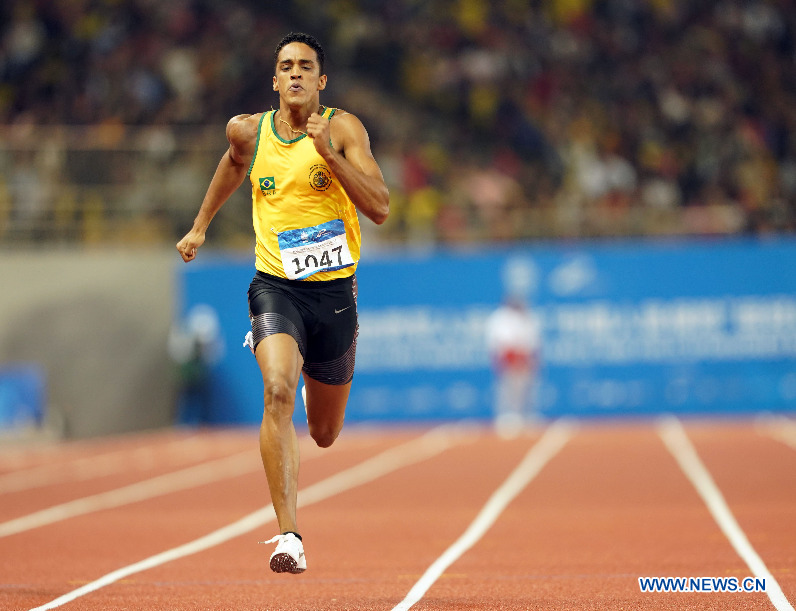 Aldemir Junior of Brazil competes during the men's 200m final of track and field at the 7th CISM Military World Games in Wuhan, capital of central China's Hubei Province, Oct. 24, 2019. (Xinhua/Jin Liangkuai)