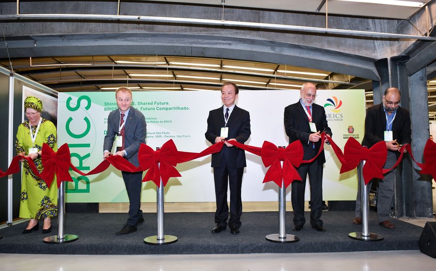 Co-chairmen of the BRICS Media Forum cut a ribbon during the opening ceremony of the third edition of the BRICS Media Joint Photo Exhibition in Sao Paulo, Brazil, Oct. 30, 2019. (Xinhua/Xin Yuewei)