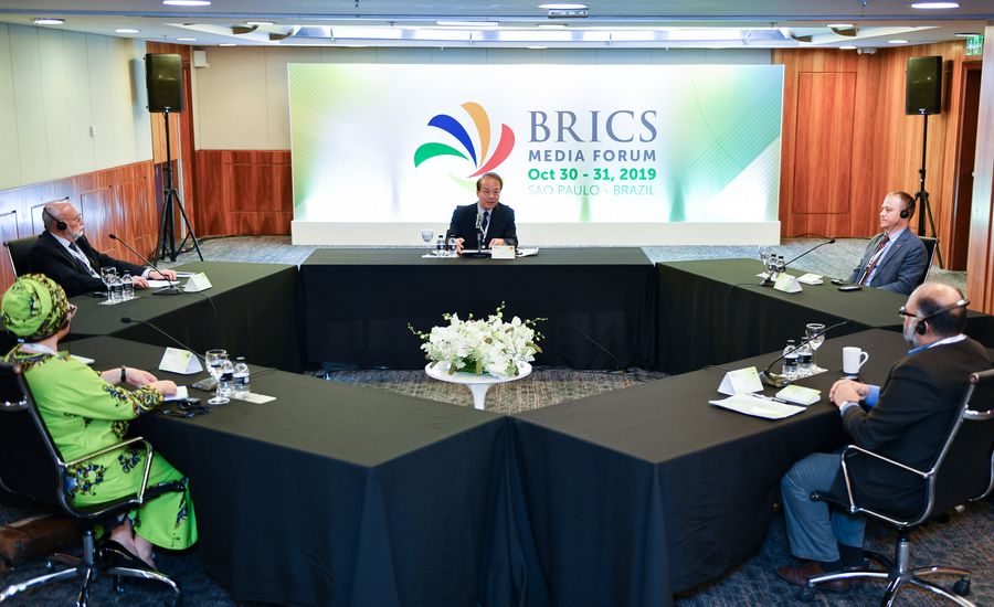 Photo taken on Oct. 30, 2019 shows the presidium meeting of the fourth BRICS Media Forum in Sao Paulo, Brazil. (Xinhua/Xin Yuewei)