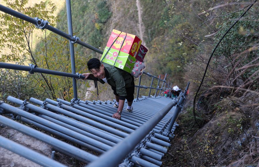 A young man of Yi ethnic group carrying food climbs a steel ladder built along the cliff in Atulie'er Village, Zhaojue County, Nov. 24, 2019. (Xinhua/Jiang Hongjing)