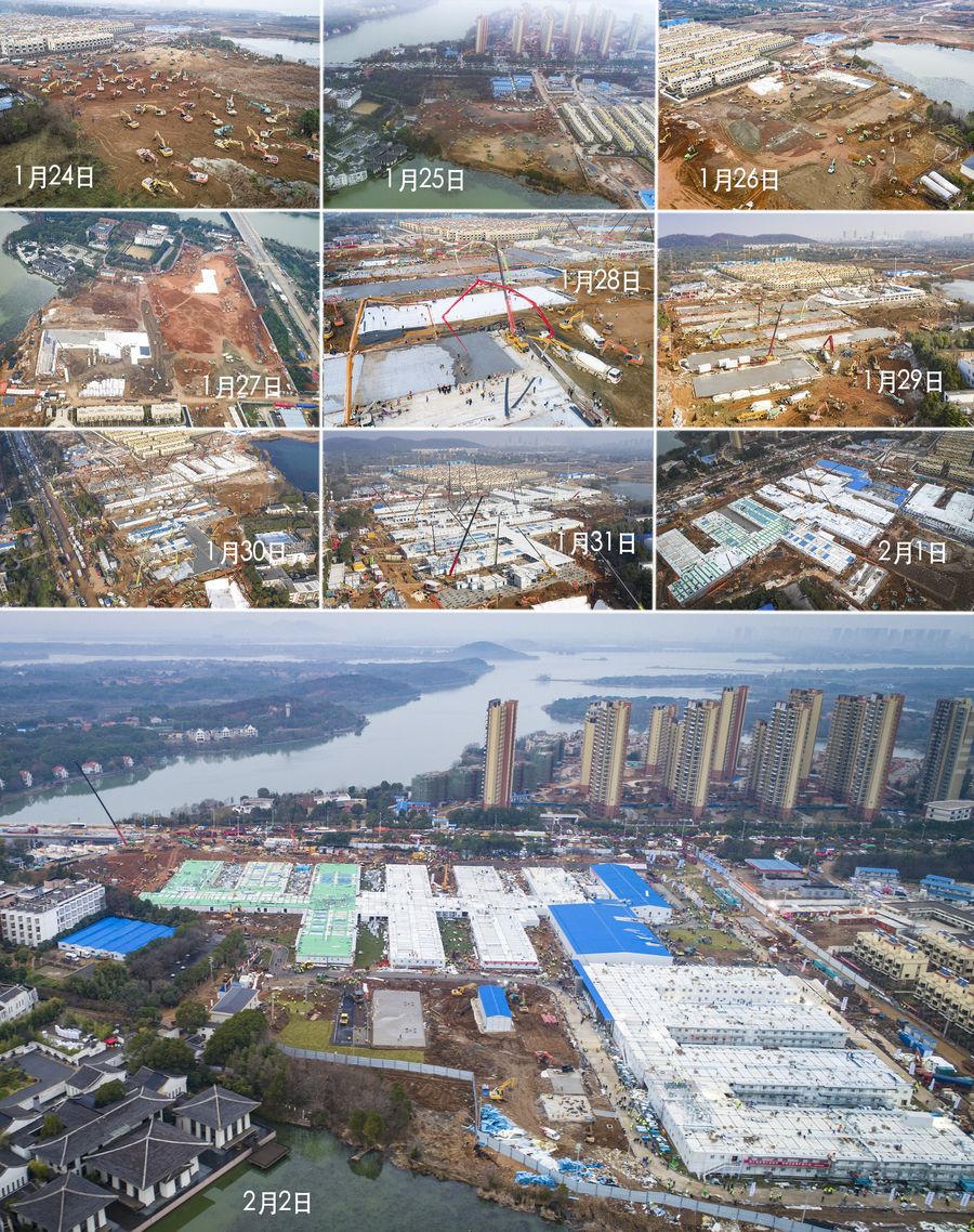 Combo photo shows an aerial view of the Huoshenshan Hospital during the past 10 days from Jan. 24 to Feb. 2, 2020 in Wuhan. (Xinhua/Xiao Yijiu)