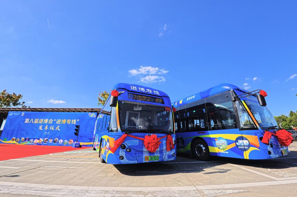 10月29日,第八届进博会“进博专线”发车仪式在上海举行。8辆“进博专线”车采用以“进博蓝”为主色调的彩色车衣设计,除了为展客商提供从外滩到国家会展中心(上海)往返交通便利外,还将巡游于市中心区域,串联起淮海路、静安寺、徐家汇、北外滩等热门商圈。第八届进博会“进博专线”于11月1日至30日全月运行。