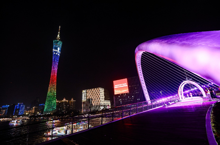 活动当晚,广州塔自落成15年后首次上演一场别开生面的“灯光变装秀”,塔身幻化出与比音勒芬相呼应的图案与色彩,仿佛也穿上了“光影华服”。而海心桥这座横跨珠江的新地标,首次化身T台。两座地标遥相呼应,成为本次活动中最宏大的背景板。模特们身着比音勒芬最新系列服饰,在桥体独特的线条与光影中穿梭,演绎出运动、时尚与都市景观的和谐共生。这一刻,品牌、城市、文化地标与人深度融合,共同向世界发出中国时尚强音。