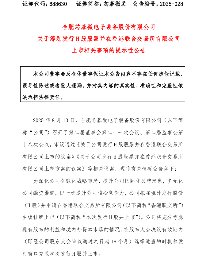 8月13日,芯碁微装公告,公司计划发行H股股票并在香港联合交易所有限公司上市,以深化全球化战略布局,提升国际化品牌形象和融资渠道,增强核心竞争力。相关议案已通过董事会和监事会审议,但具体细节尚未确定。本次发行需提交股东大会审议,并取得中国证监会、香港联交所等相关机构的备案、批准和核准。