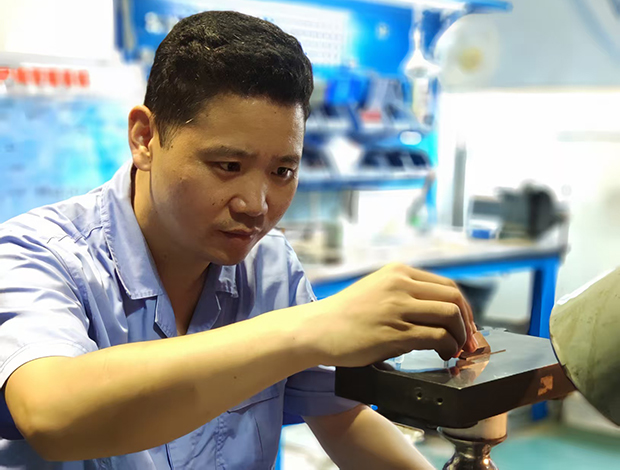 在母亲的鼓励和师傅的无私传授下,张伟最终用一个星期才啃下了这块“硬骨头”。随后的日子里,张伟勤学、勤问、勤思考,很快掌握了钳工锉、锯、錾、刮、钻等“十八般武艺”及识图技能,还利用业余时间掌握了铣车、平磨、圆磨、工具磨、电火花打孔机等设备的操作技能,渐渐成长为一名“打通关”的复合型技能人才。