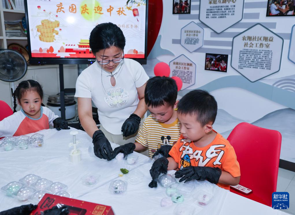 9月25日,浙江省嘉兴市南湖区南湖街道烟雨社区开展亲子月饼制作活动,孩子们在体验传统技艺的过程中感受文化魅力。