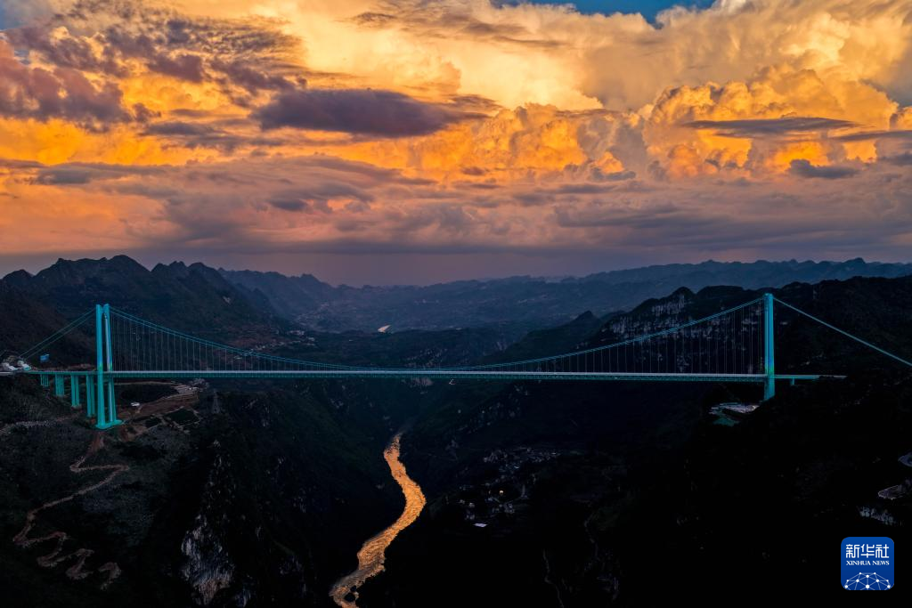 经过三年多建设,新的世界第一高桥——贵州花江峡谷大桥于9月28日正式建成通车。这是9月28日拍摄的夕阳下的贵州花江峡谷大桥(无人机照片)。