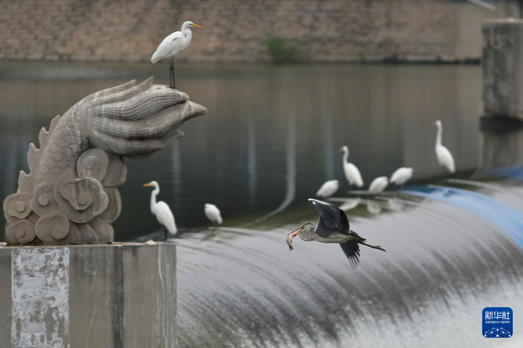 10月11日,在山东省青岛市城阳区白沙河湿地,一只苍鹭捕鱼后飞过橡胶坝。