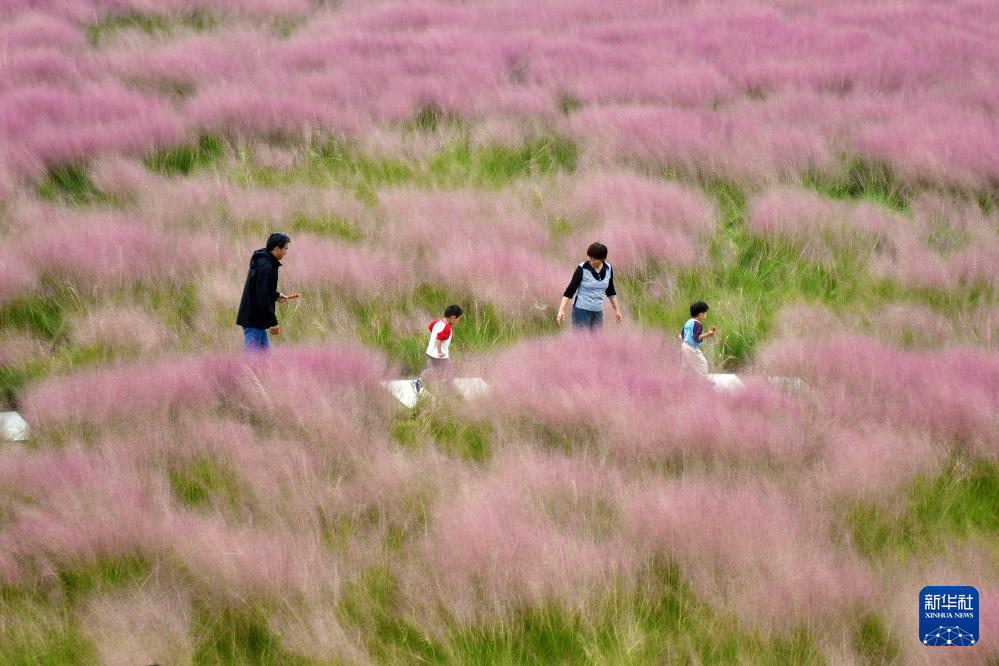 10月18日,游客在山东省临沂市平邑县柏林镇粉黛乱子草花田游玩(无人机照片)。