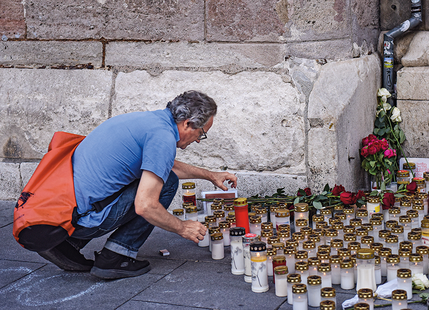 6月11日,在奥地利首都维也纳,一名男子在斯蒂芬教堂广场摆放蜡烛,悼念校园枪击案遇难者。6月10日上午10时许,奥地利第二大城市格拉茨一所学校发生枪击事件,导致包括枪手在内的11人死亡