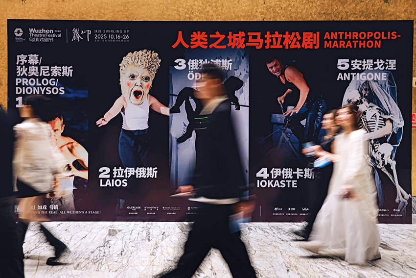 观众走过乌镇大剧院《人类之城马拉松剧》海报