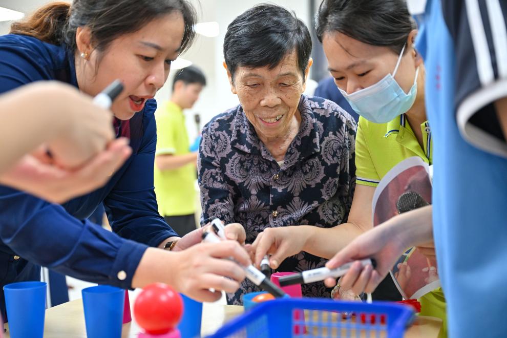 10月29日,在海口市琼山区国兴街道综合养老服务中心,老年人和工作人员、志愿者一起做游戏。