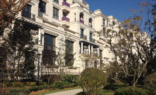 記者走訪時為工作日下午,到達(dá)項(xiàng)目時,小區(qū)門口有保安站崗, 但并未詢問記者前往何處。進(jìn)入小區(qū),仿佛走進(jìn)歐式花園,環(huán)境清幽?;▓@內(nèi),偶爾見到幾名保潔人員在清掃落葉,澆灌樹木。