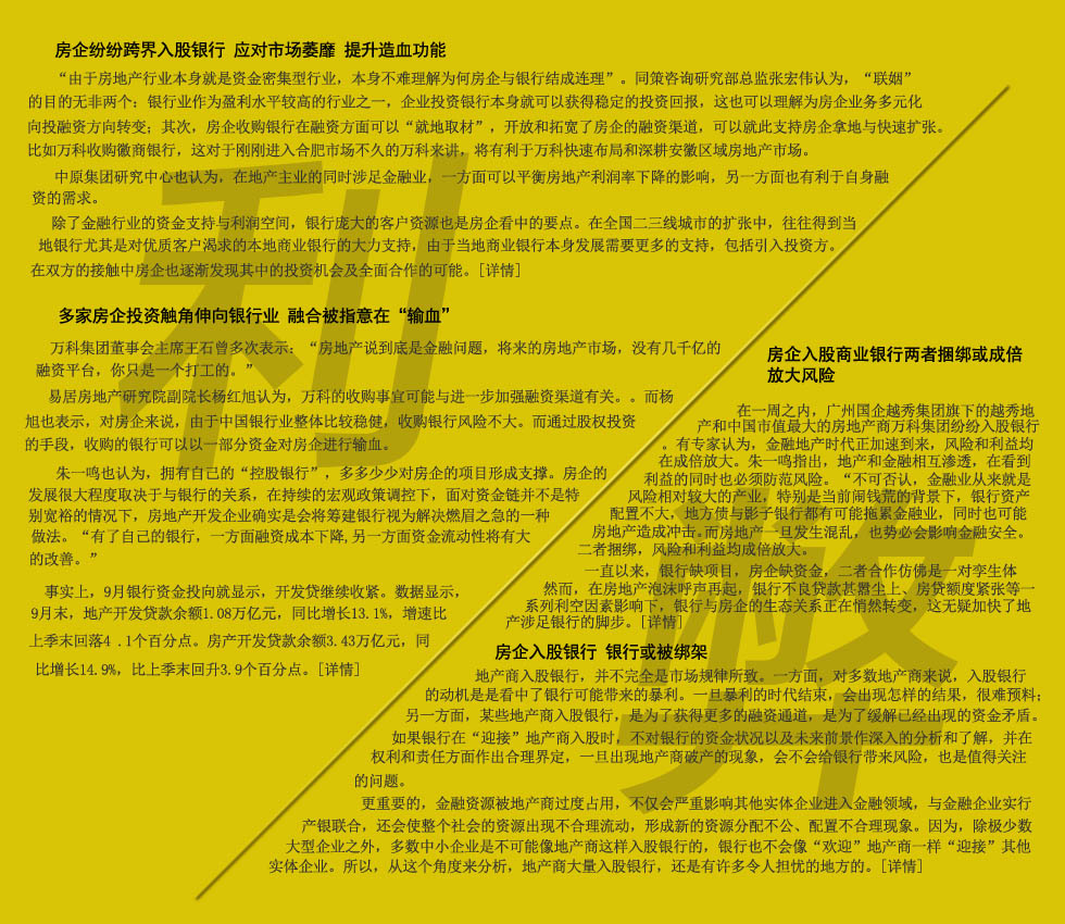 萬(wàn)科、新華聯(lián)等房地產(chǎn)企業(yè)近日紛紛表示將進(jìn)軍銀行業(yè),此舉引發(fā)"土豪"與"金融"的一輪聯(lián)姻熱潮,這也預(yù)示著具備類(lèi)金融屬性的地產(chǎn)公司正式從幕后走向臺(tái)前。業(yè)內(nèi)人士表示,房企與銀行攜手,意味著地產(chǎn)融資和多元化投資將出現(xiàn)新模式。房企參股銀行一方面可以為其融資提供便利,另一方面可享受銀行業(yè)較高的投資回報(bào),成為多元化投資的新途徑。[詳情] |