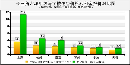 僅以蘇州為例,其甲級(jí)辦公寫字樓的平均售價(jià)已奔至“2字頭”;租金報(bào)價(jià)與南京同類物業(yè)的差距也已縮小至1.5元/平方米/天。 |