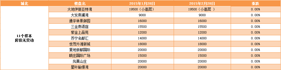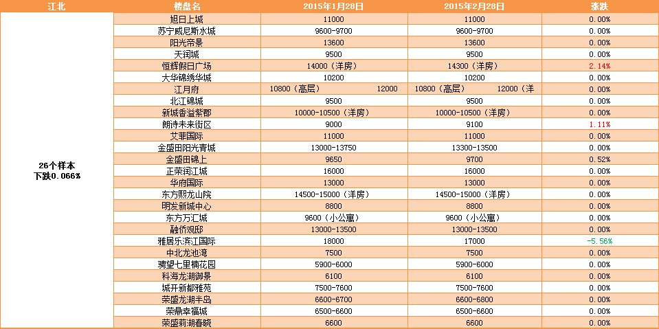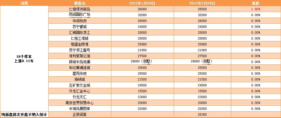 新華房產(chǎn)記者統(tǒng)計發(fā)現(xiàn),2015年2月南京樓市八大板塊中,江寧、河西、城東房價上漲,江北房價下跌,其余板塊房價無變動。 綜合結(jié)果,2月房價環(huán)比微漲0.12%。 [詳細]