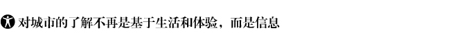 |  城市越冒險,生活其中的人們對城市就會越陌生。可見的事實是,人們對城市的了解不再是基于生活和體驗,而是信息。此前延續(xù)多年的城市生活規(guī)律和節(jié)奏被互聯(lián)網(wǎng)打破了,互聯(lián)網(wǎng)把城市的每一部分都終端化,城市的每一個具有生命特征的組織不再受生理和情理的連接,而是信息的連接。一方面,信息成為連接人與人、人與城市、城市與城市的單一工具,信息把城市圈成了地域以外的另一種空間,只是,信息的流動性并沒有協(xié)助人了解城市,反倒是增加了越來越多的陌生。 另一方面,陌生又完成了城市開放意象的表達,這也是一座城市為什么能吸引外來者旅游、造訪、定居的重要原因。信息的獨立和集合讓人、讓城市的局部在封閉系統(tǒng)之外,又像互聯(lián)網(wǎng)時代的物流一樣多樣化、復合化。 | ||||||||||||||||||||||||||||||||||||||||||||||||||||||||||||||||||||||||||||||||||||||||||||||||||||||