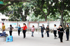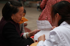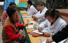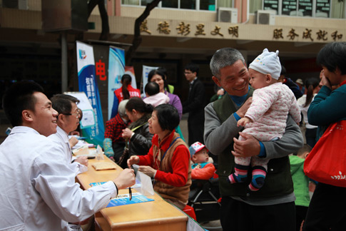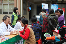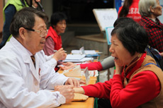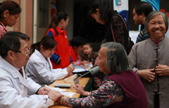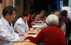 | 新華網社區(qū)行義診區(qū) | 義診區(qū)等候人群多 | 老中醫(yī)看看有什么毛病 | 量完血壓給張體檢單 |