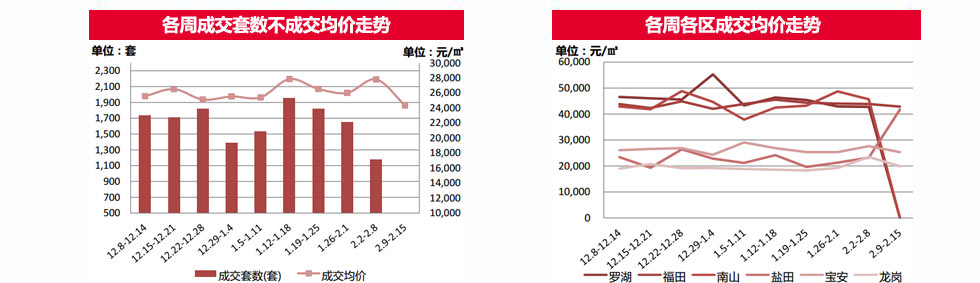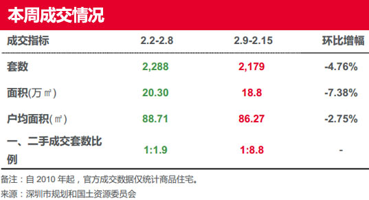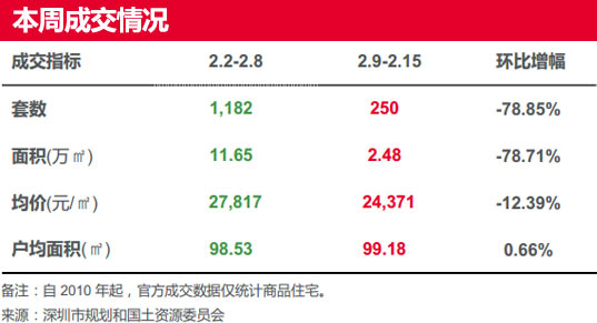 |  | 本周(2.9-2.15)鹽田區(qū)只成交1套高端物業(yè)“藍(lán)郡西堤”,成交均價(jià)環(huán)比上漲79.9%。其余各區(qū)均不同程度下跌,其中,龍崗區(qū)跌15%、寶安區(qū)跌8.42%、福田區(qū)跌2.36%;羅湖區(qū)及南山區(qū)本周(2.9-2.15)無成交。 | |||